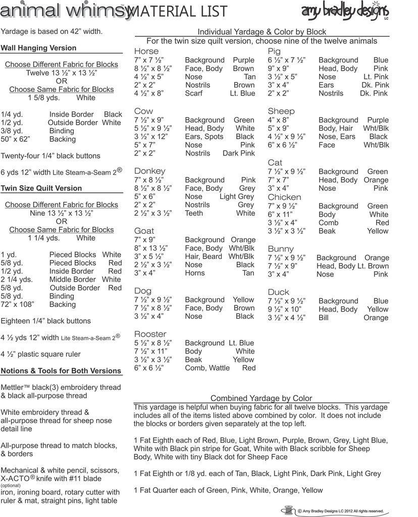 Animal Whimsy quilt pattern includes full size patterns, full size placement sheets, and instructions to make a 42in x 54in wall hanging with twelve animal blocks and a 60 1/2in x 96 1/2in twin size quilt with nine animal blocks and nine pieced shoo-fly blocks.