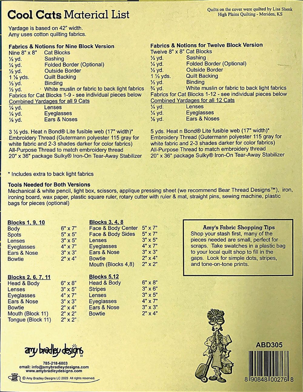 Cool Cats quilt pattern includes full size patterns, full size placement sheets, and instructions to make a 31 1/2" x 31 1/2" wall hanging or a 31 1/2" x 39" wallhanging. The technique is fusible applique. The block size is 7" x 7".