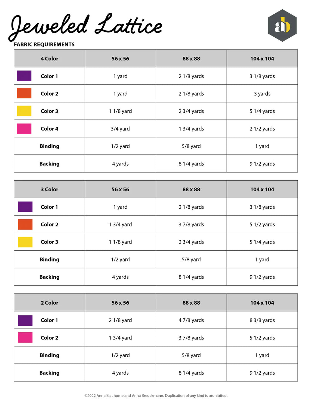 Jeweled Lattice Quilt Pattern is the newest pattern by Anna of Anna B at home. Jeweled Lattice is a versatile yardage quilt pattern with variations using 2, 3, or 4 fabrics with stunning results each time. Available in 3 different sizes, throw, full/queen and king.