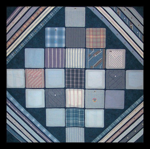 This quilt is made up of 25 pockets from the fronts of men's shirts. The diagonal elements on the corners of the quilt are made from the plackets of the same shirts. Other ideas for this pattern: Use the 25 pockets to hide surprises