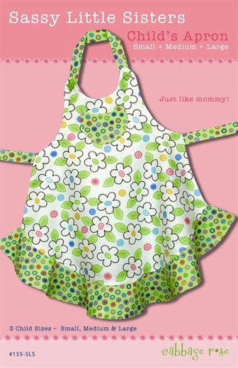 This is the childrens version of the top selling Sassy Little Apron pattern. There are three sizes and it sews up fast. Also available, PLUS sizes. Small, Medium, and Large children sizes, Cabbage Rose apron pattern.