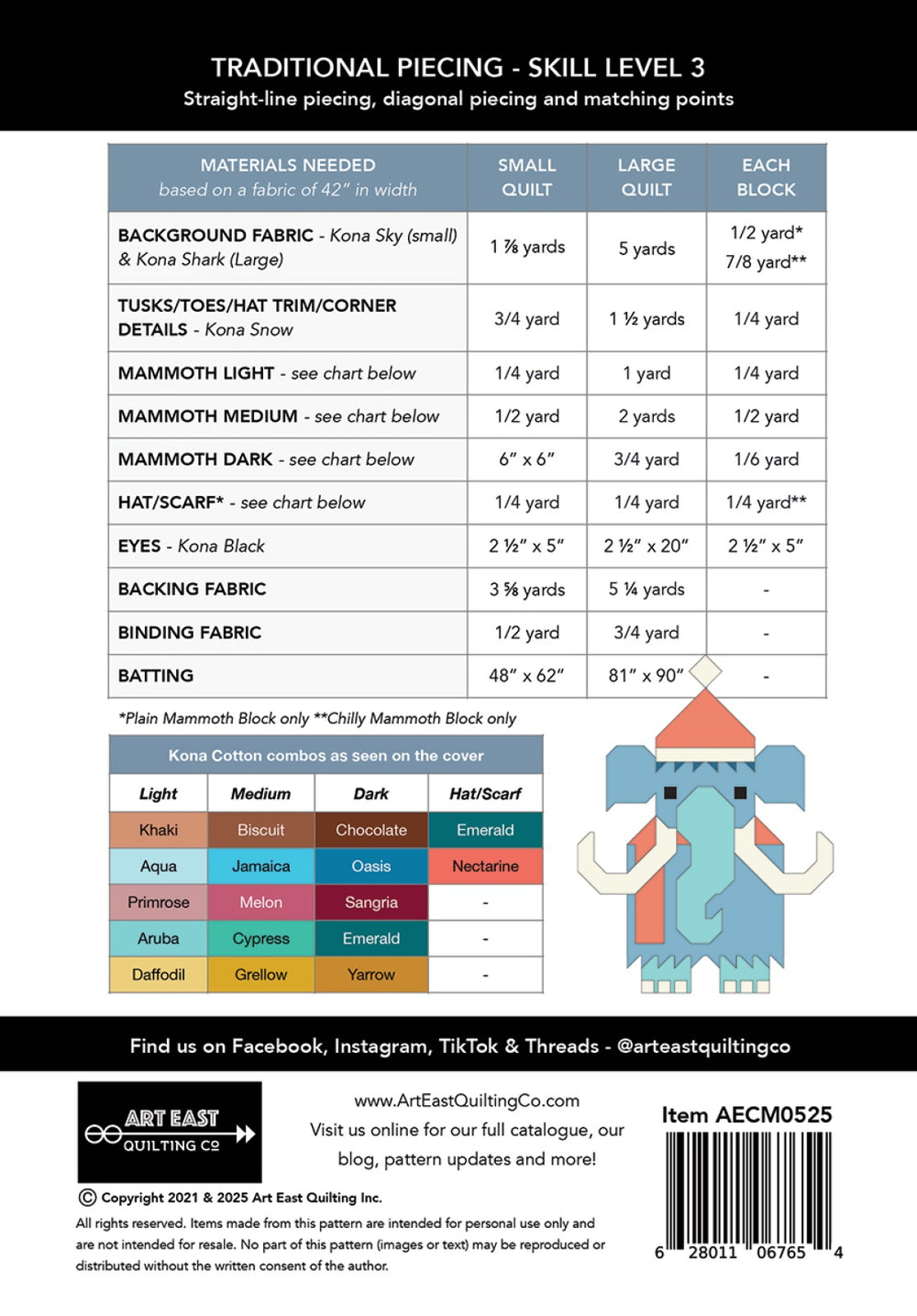 This prehistorically cool quilt pattern offers instructions for two quilt sizes: a 43 ½” x 57 ½” quilt featuring a single mammoth, and a 77” x 86” quilt with four mammoths. You can choose to adorn your mammoth with a hat and scarf for winter gear, or keep it cool without. The large block sizes (31 ½” x 34 ½” & 31 ½” x 34 ½”) mean even a single block can create a striking quilt. The design is elegantly framed with half-square-triangle details, as seen on the cover. Utilizing traditional piecing techniques, the Chilly Mammoth pattern heavily relies on the Stitch & Flip method. While there are several points to match, the generous piece sizes provide ample wiggle room for achieving perfect points. This project is ideal for both adventurous beginners and experienced quilters alike!