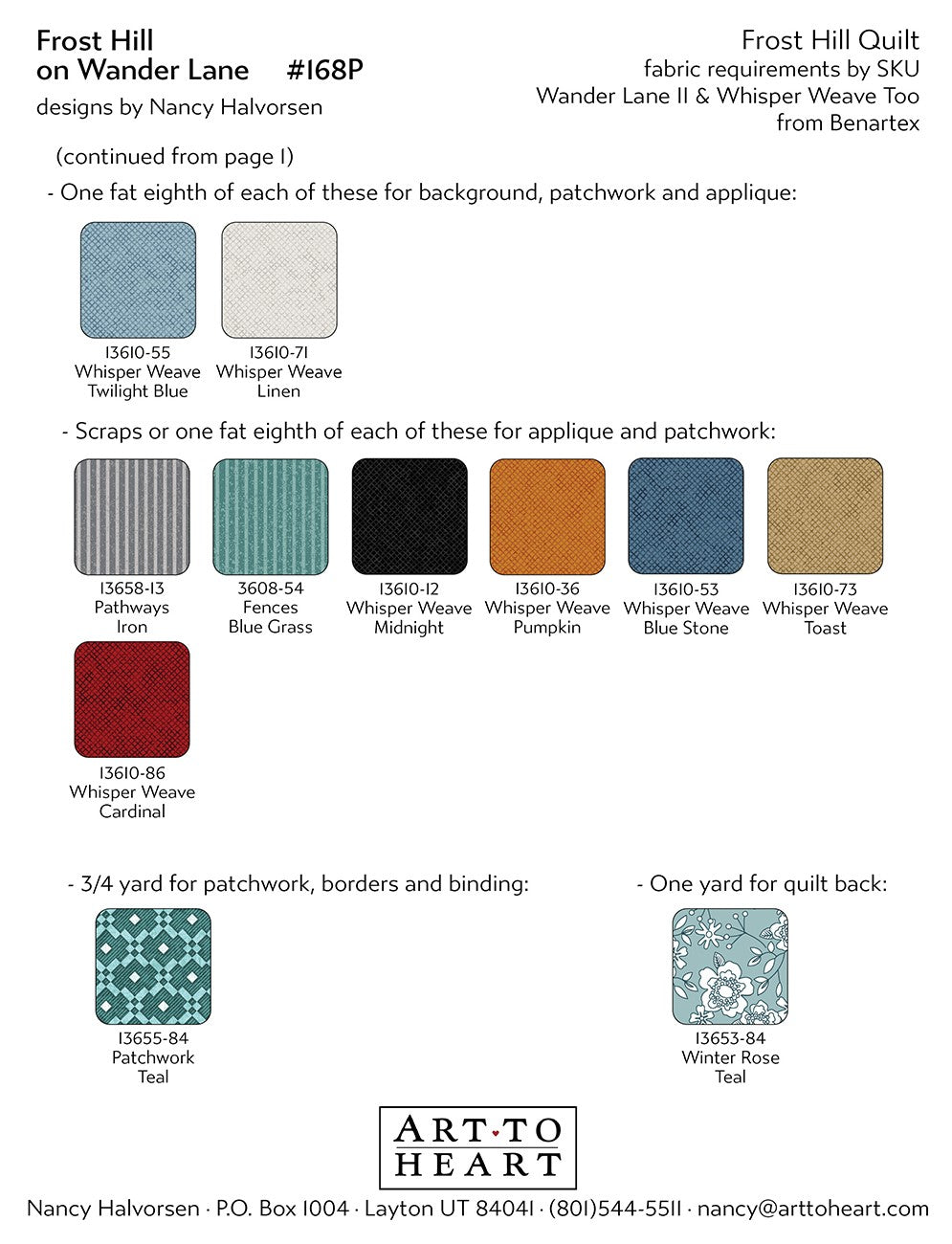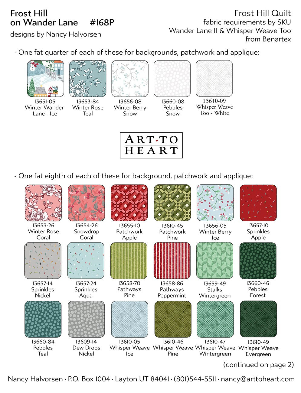 See what's happening On Wander Lane this month with Frost Hill On Wander Lane by Art to Heart. This 8-1/2" x 11" pattern offers a stand alone block of the month quilt that measures 30" square, plus six additional projects including an additional appliqué project, a table topper, pot holder, pillows, mini quilts and mug rug!
