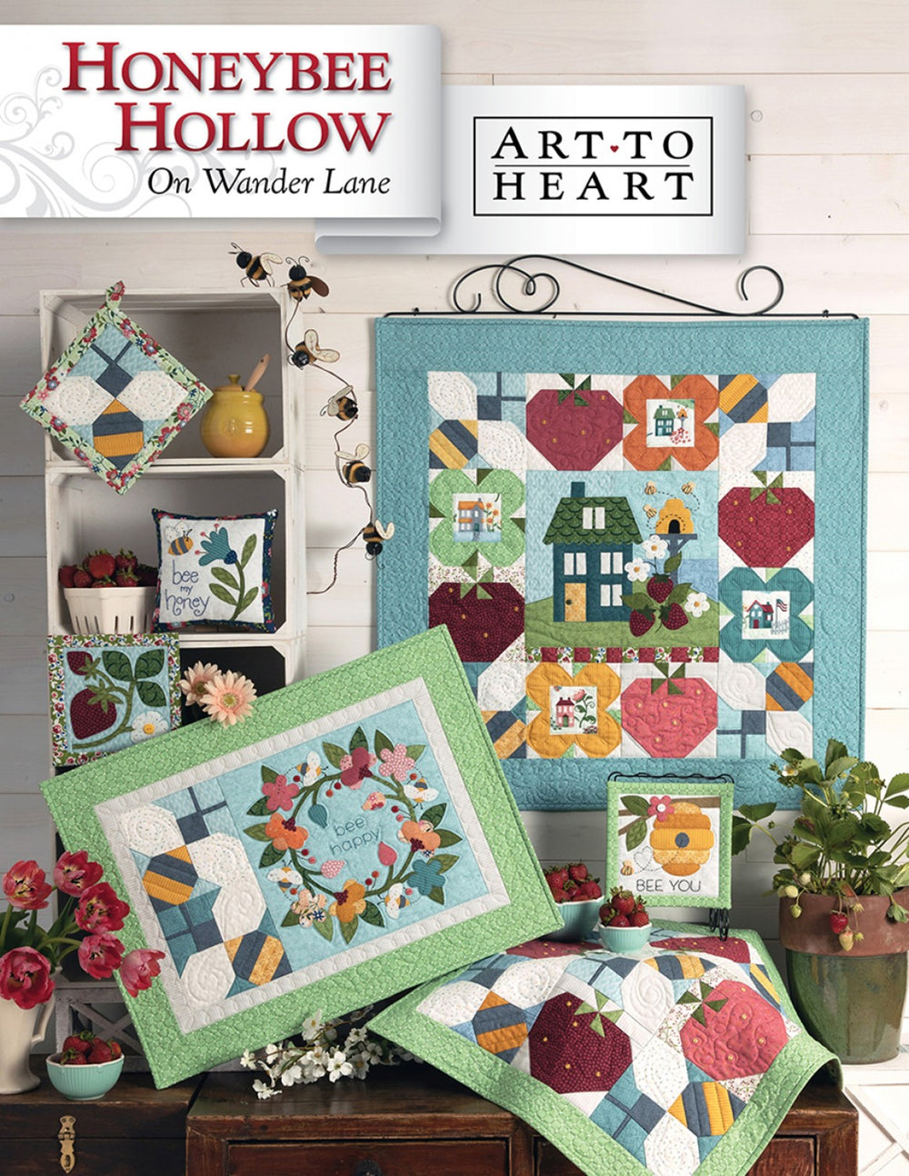 See what's happening On Wander Lane this month with Honeybee Hollow On Wander Lane by Art to Heart. This 8-1/2" x 11" pattern offers a block of the month quilt plus six additional projects including a table topper, pot holder, pillows and more! There's lots of fun happening On Wander Lane!