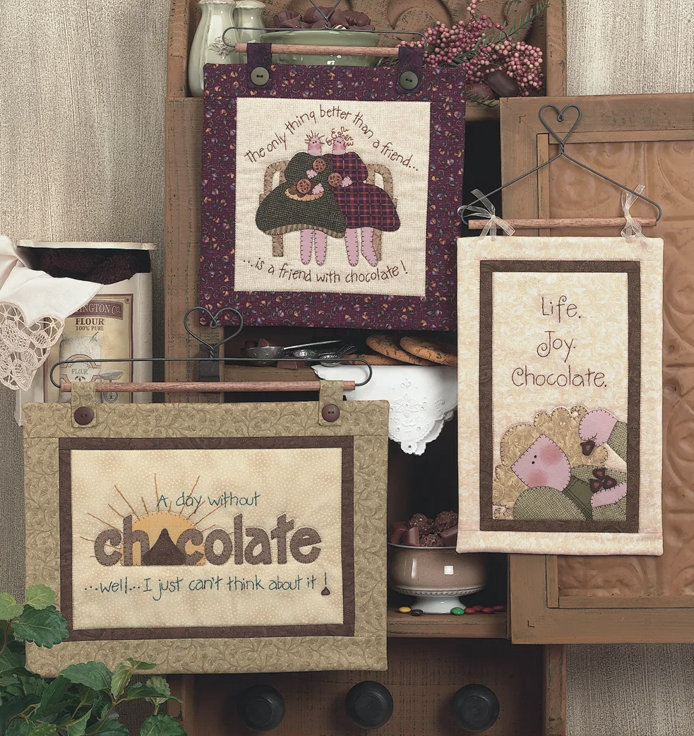 Chocolate is at the core of all my creativity. Celebrate your love of chocolate with these fast and easy fusible applique quilts. "Life. Joy. Chocolate." quilt 8-1/2" x 13", "The only thing better than a friend is a friend with chocolate!" quilt 11" square, "A day without chocolate...well...I just can't think about it!" 15" x 11-1/2". To see all items related to this product search on OH! CHOCOLATE.
