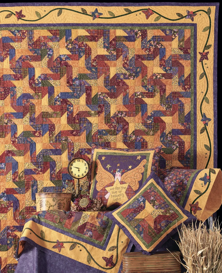 "When stars above shine in the night, we feel the love of heaven's light." These wonderful quilt table topper and pillow designs will brighten any room and can be done in any color combination for a seasonal look. The designs use very easy piecing and fusible applique. Queen/Full, Twin and Wall Quilt sizes.