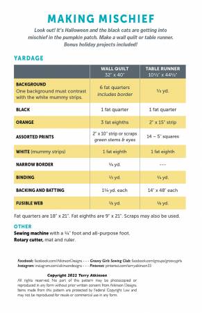 Look out! It's Halloween and the black cats are getting into mischief in the pumpkin patch. Make a wall quilt or table runner. Bonus holiday projects included!