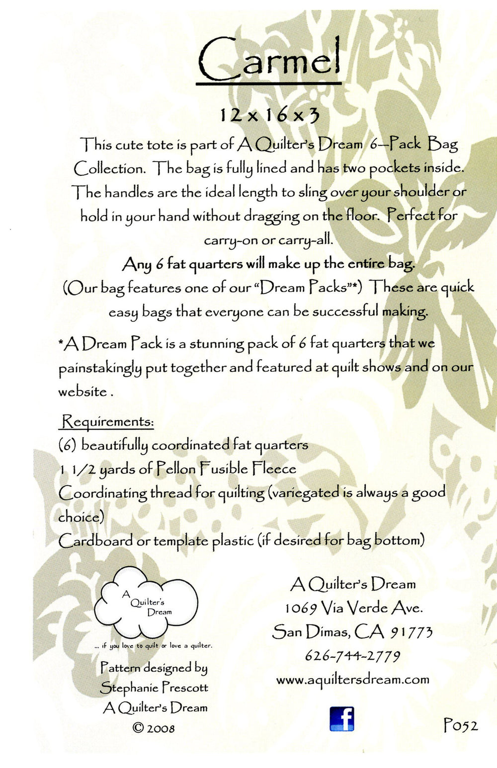 This cute tote is part of A Quilters Dream 6 Pack Bag Collection. The bag is fully lined and has two pockets inside. The handles are the ideal length to sling over your shoulder or hold in your hand without dragging on the floor. Perfect for carry-on or carry-all. Any 6 fat quarters will make up the entire bag.