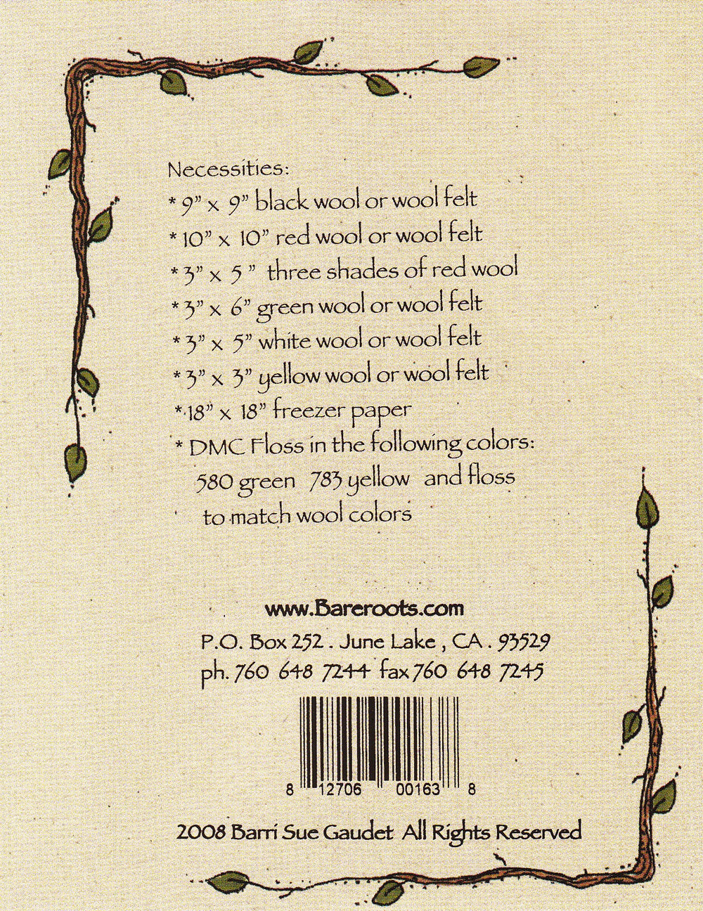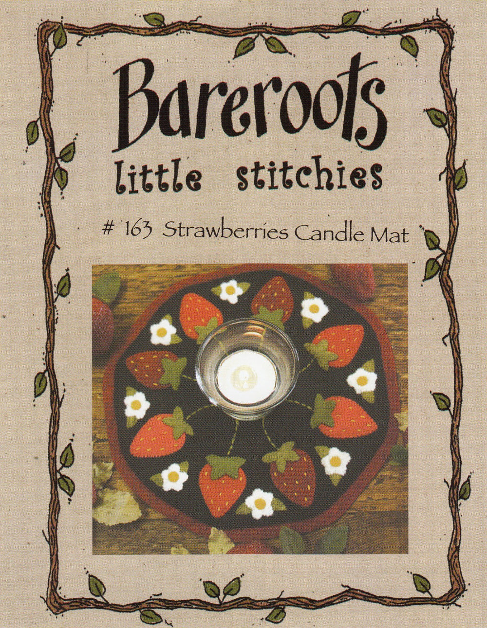 Sweet strawberries and blossoms circle this sweet candle mat. Make with wool felts and embroidery stitches. Finished size: 9 inches round.