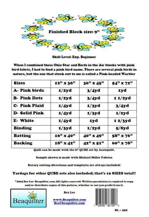 When I combined these Ohio Star and Birds in the Air blocks with pink bird fabric, I had to find a pink bird name. There are several pink birds in nature, but the one that stuck out to me is called a Pink-headed Warbler