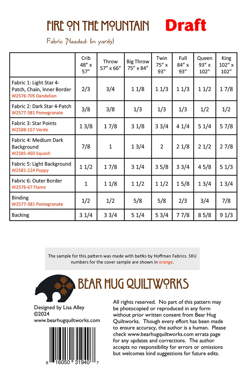 Fire on the Mountain Quilt Pattern is backordered and will ship as soon as it is back in stock.