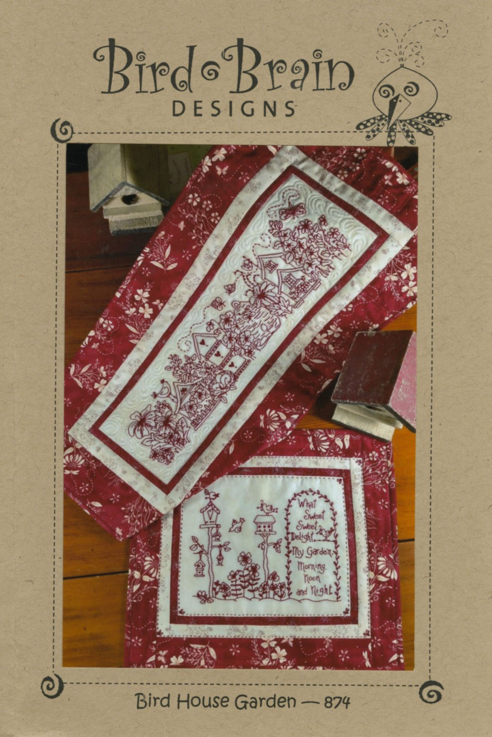 A charming RedWork Garden is filled with Flowers and Bird Houses to enjoy in your home ALL year long. The generously sized Bird House Garden Table Runner is framed with In Stitches Collection Fabrics complete with whimsical Flying Things and lovely Wildflowers! The smaller RedWork Bird House collection and Verse makes a perfect Wall Hanging or clever Table Topper.