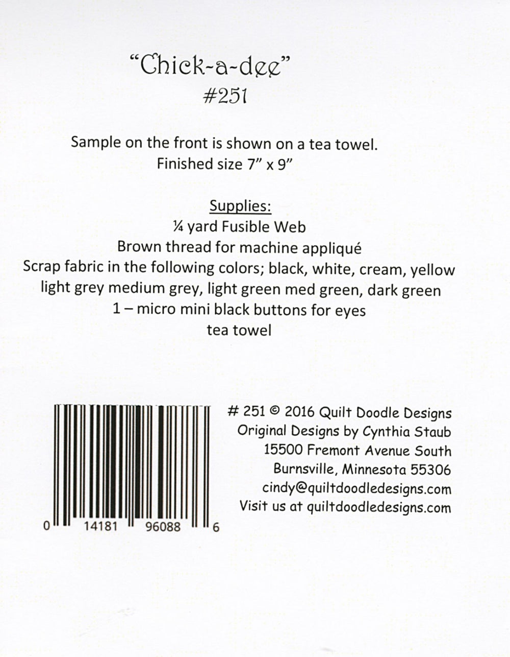 This applique design can be put on a tea towel like the directions instruct or used as a quilt square, appliqued pillow or any project that your imagination can think up. Let your imagination go! This design would also be cute on a sweatshirt or on a placemat. This adorable chick-a-dee would also be adorable sewn on a fabric bag for a reusable gift bag. Let your imagination go!