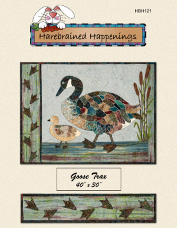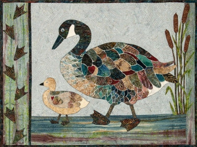 This pattern is for a Canada Goose and her baby walking along the water with bulrushes along the right side and webbed feet along the left. The pattern includes a full size 24" x 24" printed pattern diagram. It is machine or hand applique pattern. The finished size is 40" x 30", 19" x 14" - bottom picture on front of pattern.