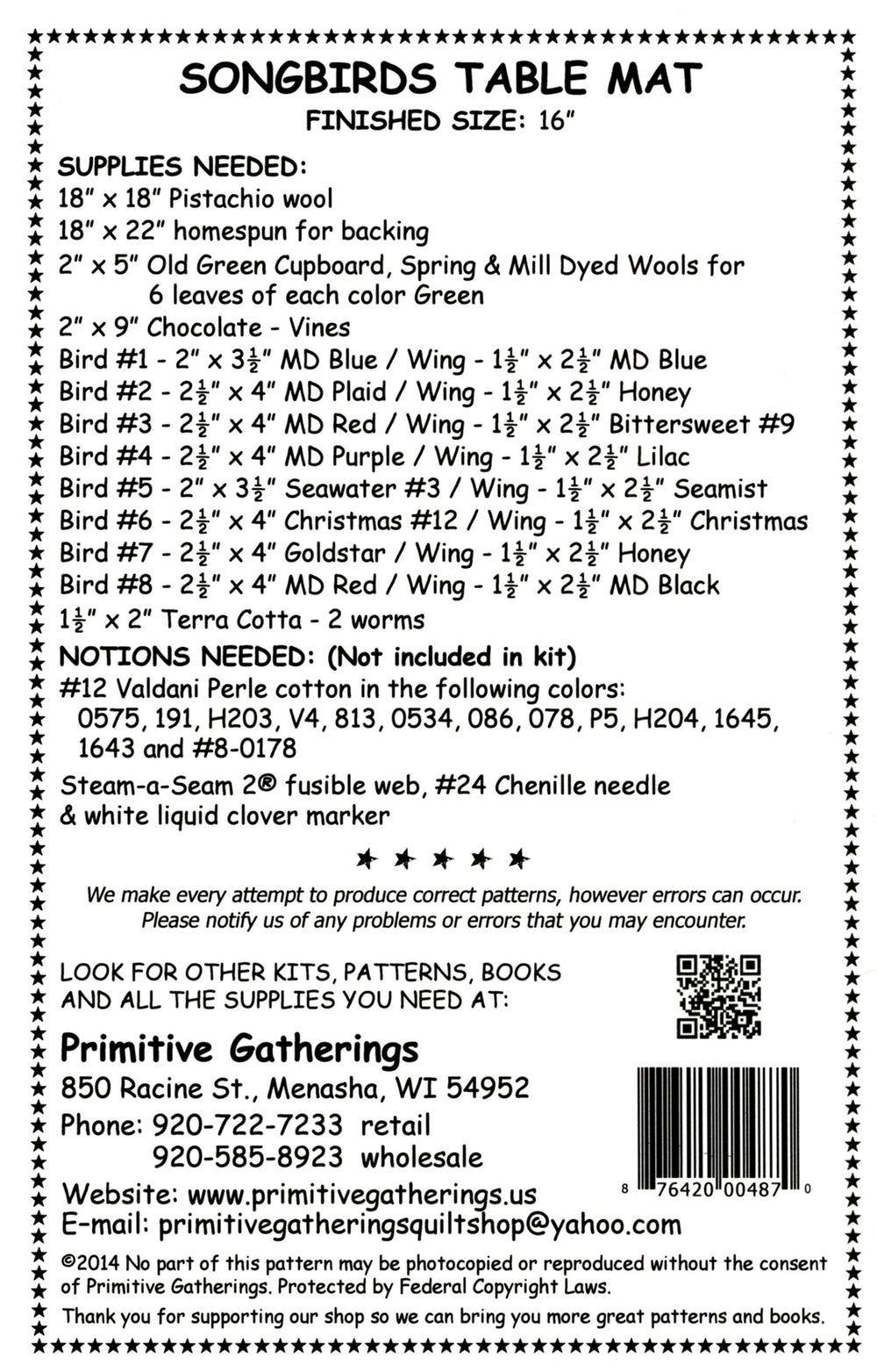 A sweet new wool applique mat for anyone who loves songbirds. It will be 16 x 16 when finished. This would make a perfect gift for a bird lover along with some bird seed or a feeder!