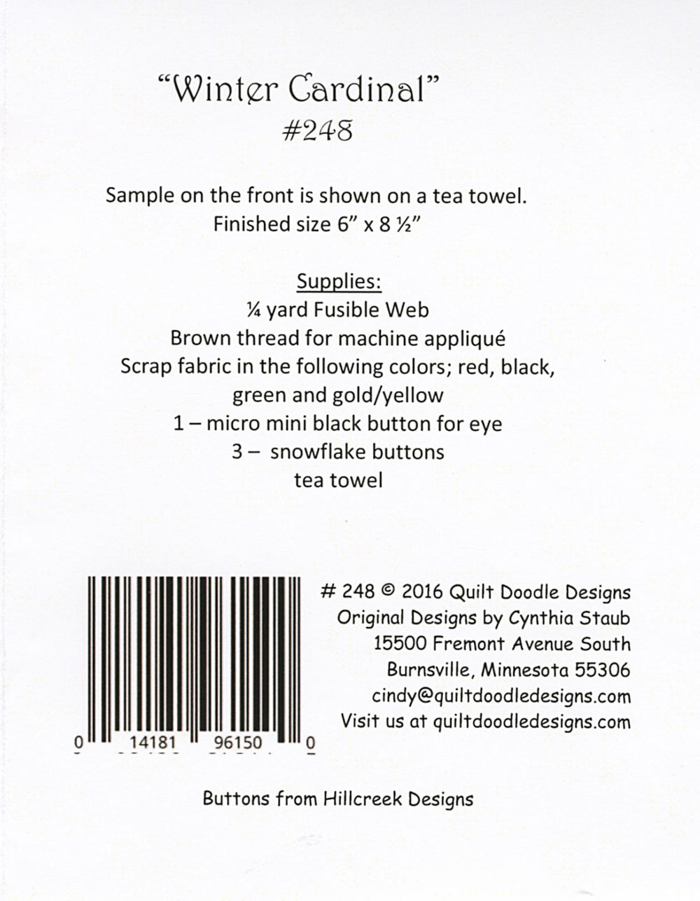 This applique design can be put on a tea towel like the directions instruct or used as a quilt square, appliqued pillow or any project that your imagination can think up. Let your imagination go! Winter Cardinal would also be cute on a sweatshirt or on a placemat. This adorable Cardinal would also be adorable sewn on a fabric bag for a reusable gift bag. Let your imagination go!