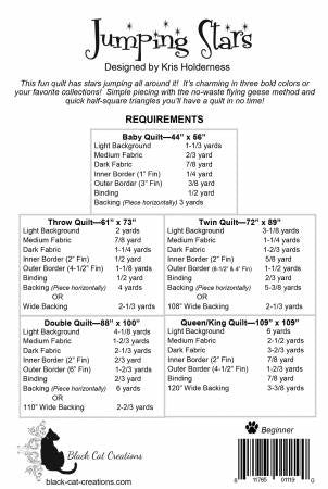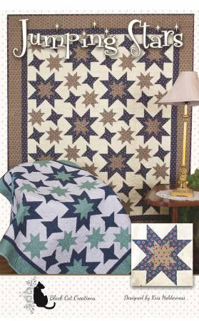 This fun quilt has stars jumping all around it! Its charming in three bold colors or your favorite collections! Simple piecing with the no-waste flying geese method and quick half-square triangles you'll have a quilt in no time!