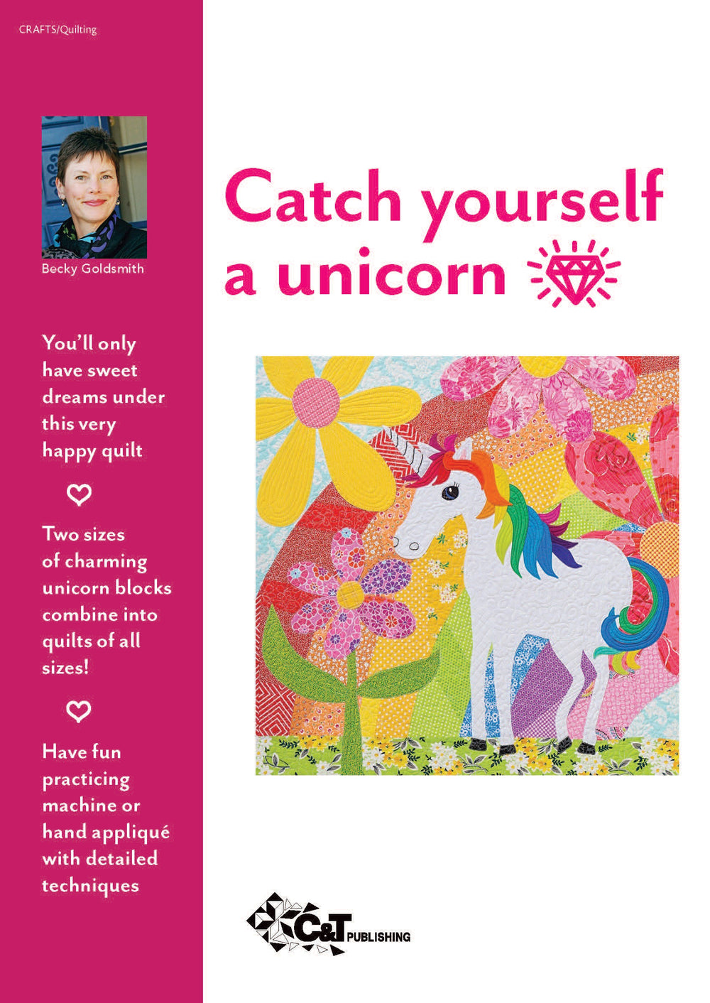 From best-selling author Becky Goldsmith of Piece O' Cake Designs comes this totally adorable, rainbow-colored quilt to applique. With 2 sizes of unicorn blocks (35in x 35in and 50in x 50in) and 5 sizes of quilts (wall, crib, twin, throw, and queen), you'll be able to make an enchanting quilt for all the unicorn lovers in your life, large or small! Includes instructions for both needle-turn applique and machine applique, as well as finishing techniques.