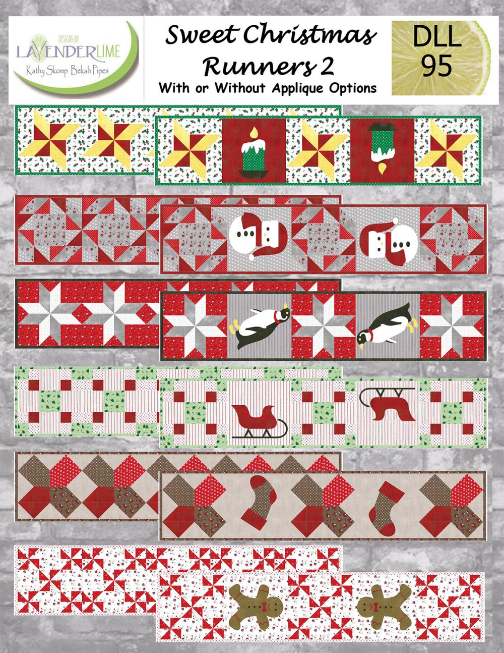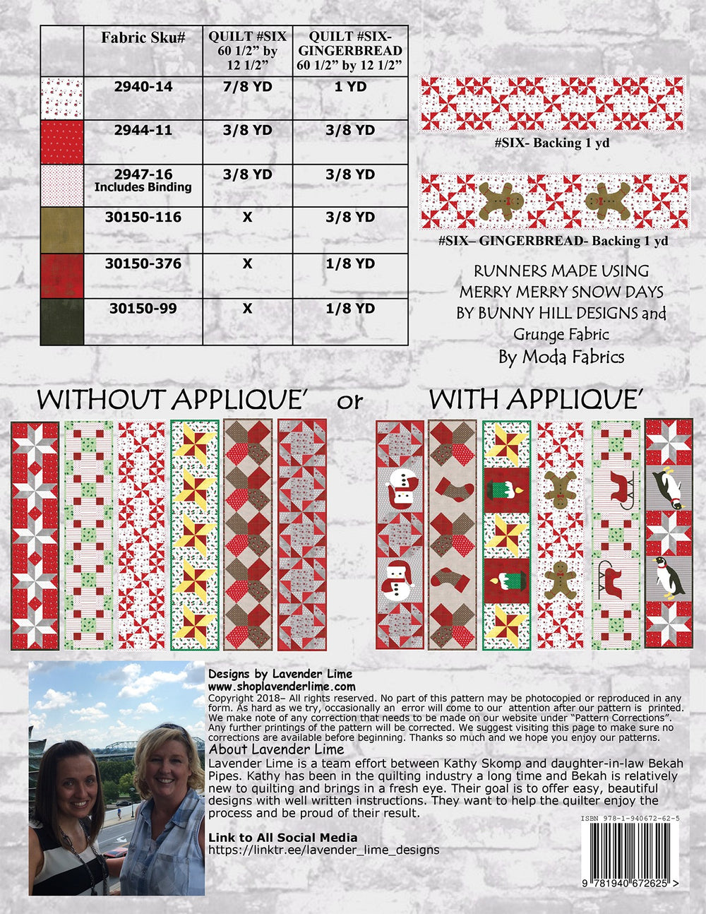 12-holiday table runners- 6 are all pieced and 6 are pieced and appliqued. Make a few to switch out. Quick and so easy. Great hostess gifts. Sample runners use Merry Merry Snow Days by Moda Fabrics.