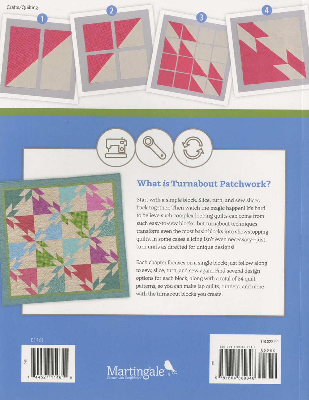 Start with a simple block. Slice, turn, and sew slices back together. Then watch the magic happen! It’s hard to believe such complex-looking quilts can come from such simple-to-sew blocks, but turnabout techniques transform even the most basic blocks into showstopping quilts. In some cases slicing isn’t even necessary--simply turn units as directed for unique designs! Each chapter focuses on a single block--just follow along to sew, slice, turn, and sew again. Quilters will find several design options for each block, along with a total of 23 quilt patterns, so they can make lap quilts, runners, and more with the turnabout blocks they create. A fun, refreshing twist for quilters: make lots of different quilts from a single block design. Includes six different blocks with turnabout variations. Projects are so easy, they’re suitable even for first-time quilters.