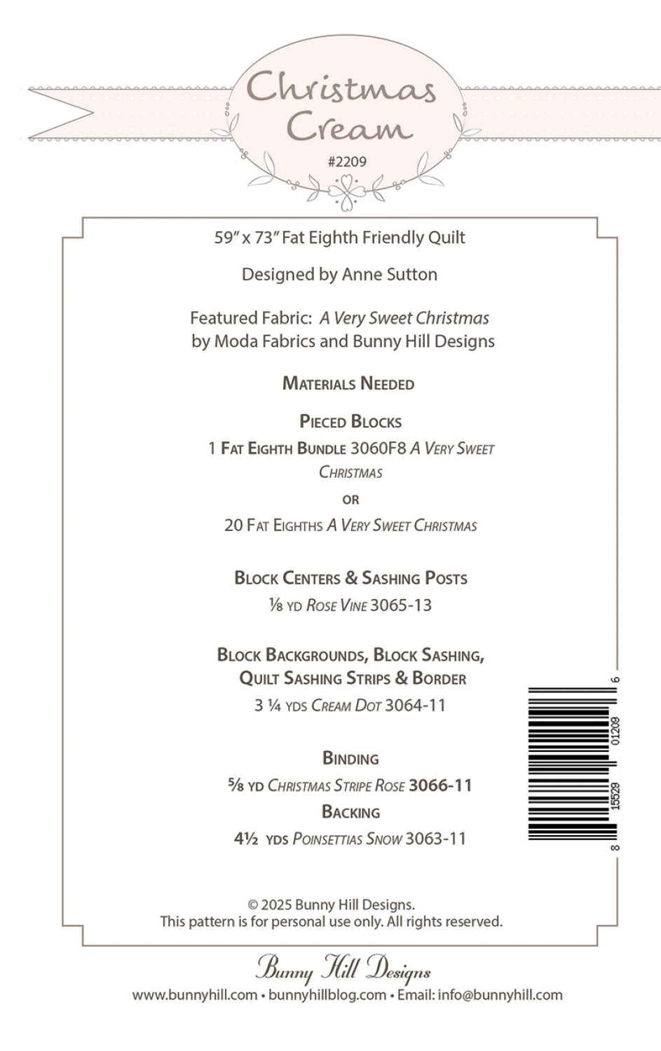 Christmas Cream, 59 x 73 quilt. Perfect size for a cuddle quilt, a wall quilt, or to display diagonally across a bed. Fat eighth friendly, it's a fun quilt to make!
