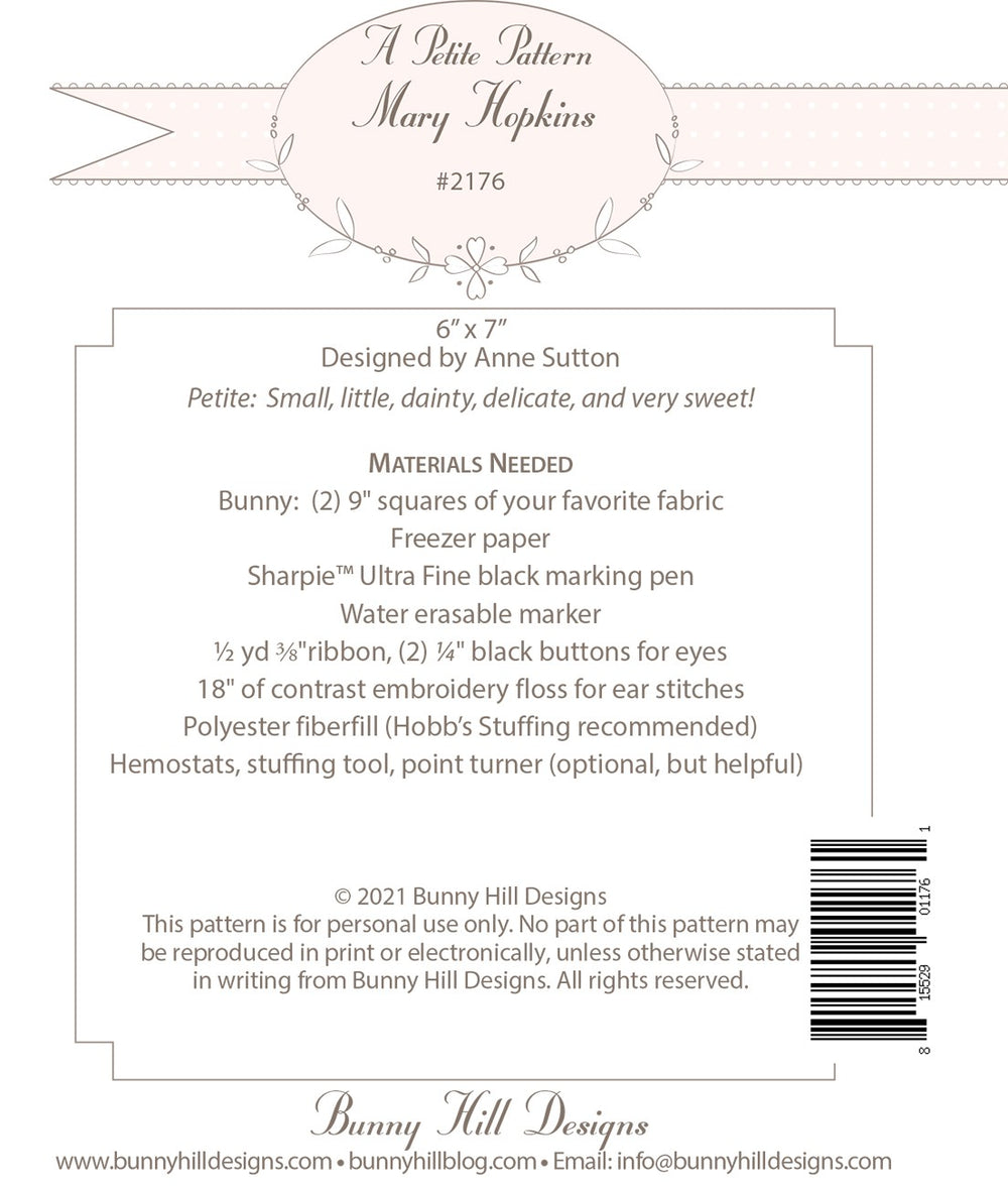 If you love bunnies, you’ll want to add Mary Hopkins to your collection. She’s simple to make and perfect for beginners. Follow our method of construction and she’ll turn out perfect every time. She’ll decorate an Easter basket, look cute tied to a present, make several and use her in a garland. She’s one bunny everyone will love.