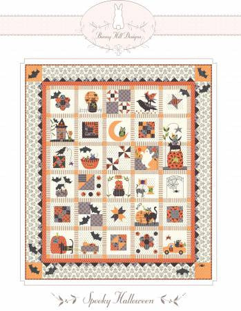 Halloween Row of the Month Quilt 46 1/2" x 53 1/2". Six months of Halloween fun with a combination of piecing, applique and embroidery. Complete one row each month and you'll have the quilt finished before Halloween.Spooky Halloween is backordered and will ship as soon as it is back in stock.