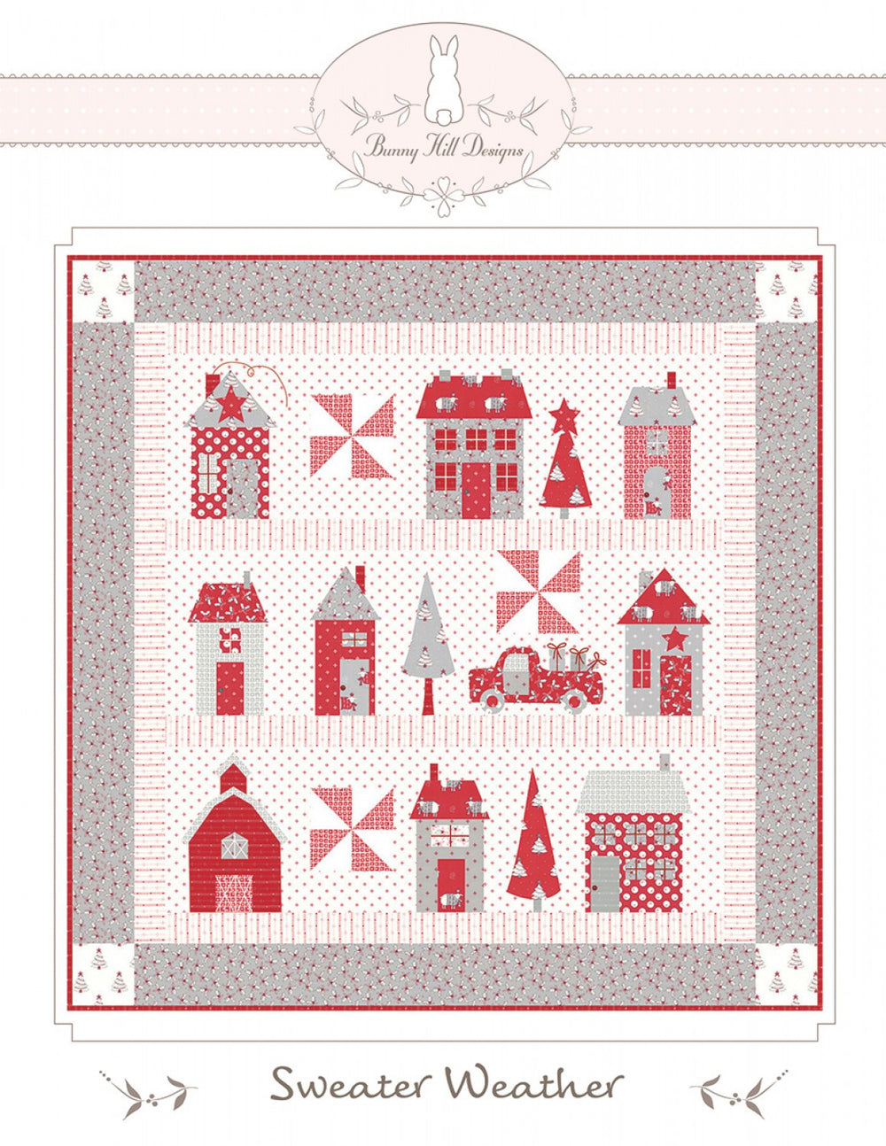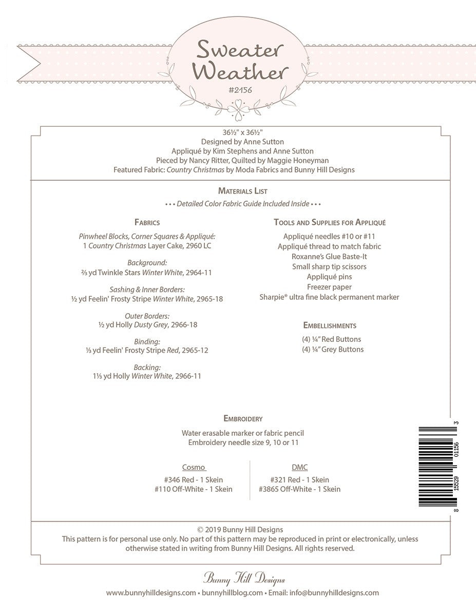 36 ½” x 36 ½” Quilt. Layer cake friendly, with fun applique, this is the perfect quilt for the winter season. The size is great for a wall hanging, table topper, or to display on the back of a couch. Easy to make using either regular or fusible applique.