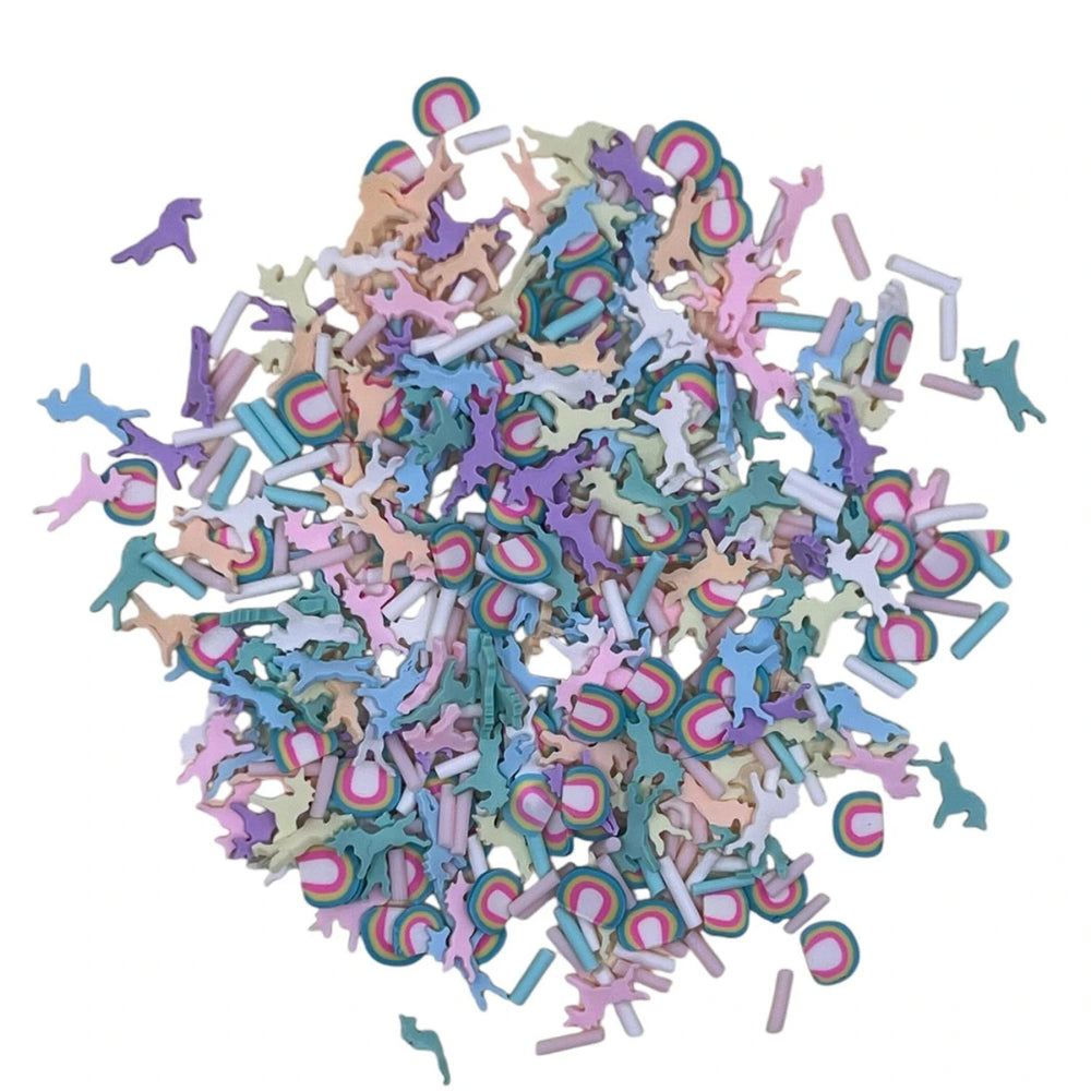 12 grams of 5mm polymer clay pieces of assorted rainbows and unicorns