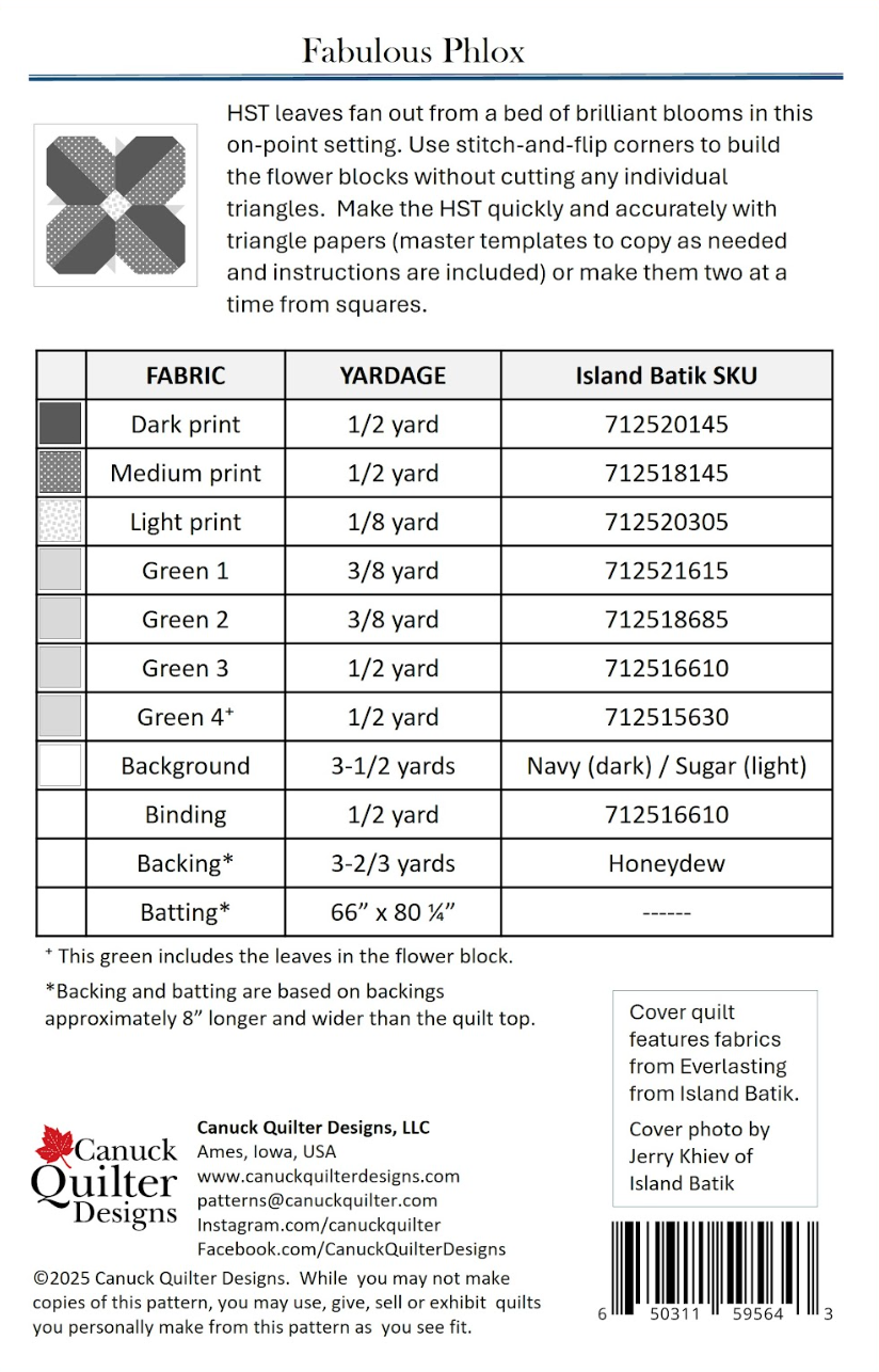 HST leaves fan out from a bed of brilliant blooms in this on-point setting, creating the illusion of borders but built entirely of 10” blocks set on point.