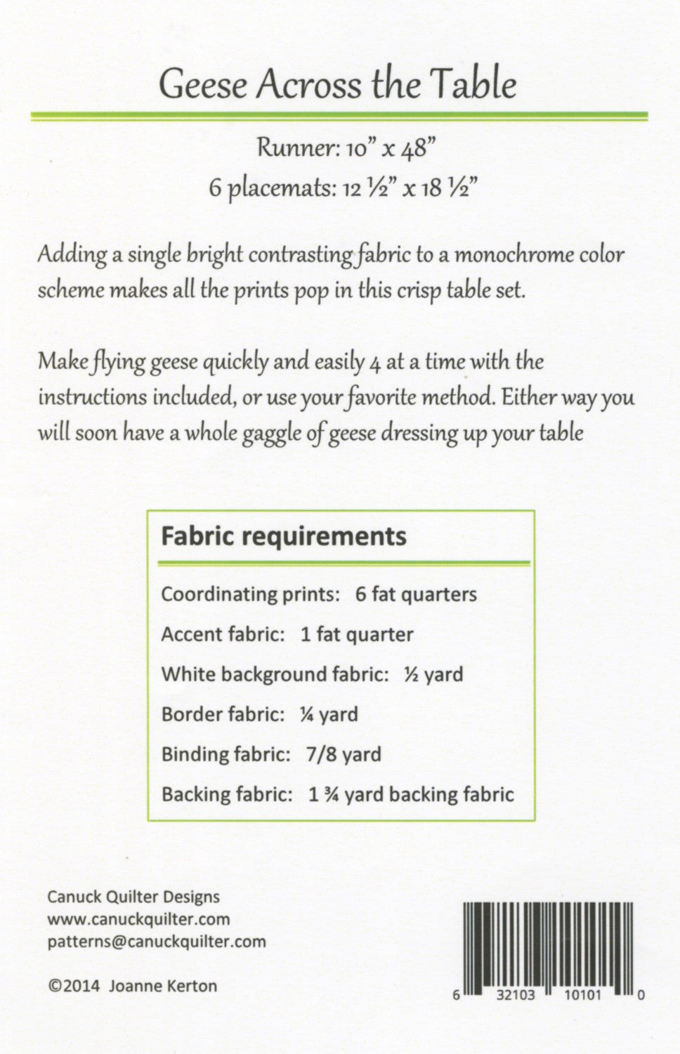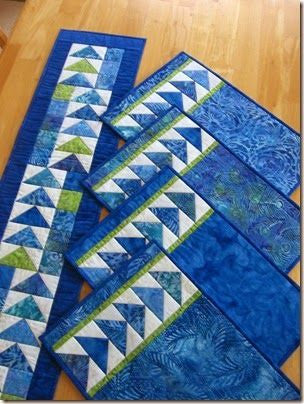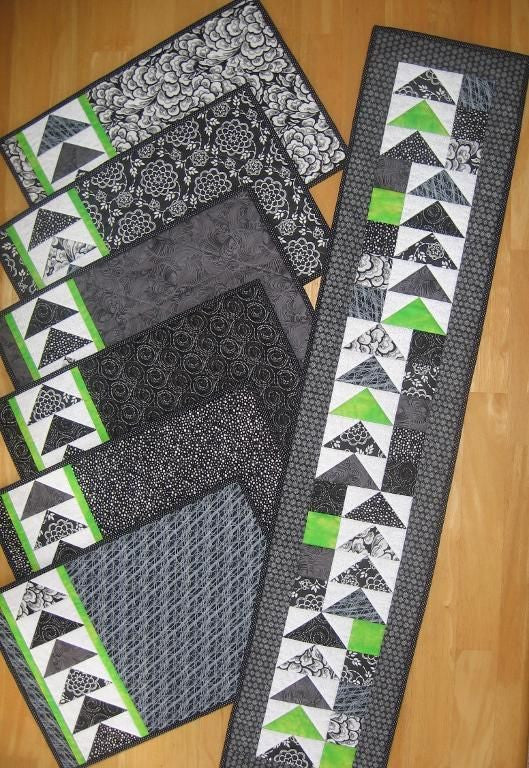 Seven fat quarters and a bit of yardage make this pattern easy to kit. Set a gaggle of geese to dress up your table! Adding a single bright contrasting color to a monochrome color scheme makes all the prints pop in this crisp table set.