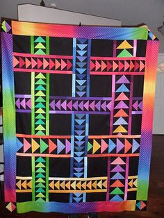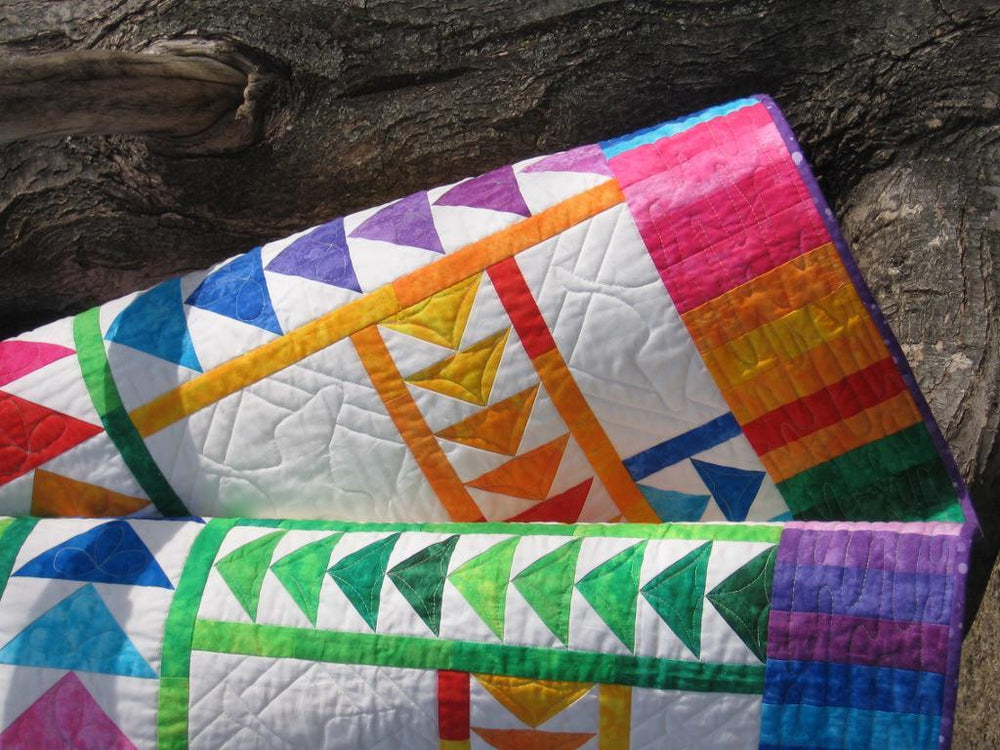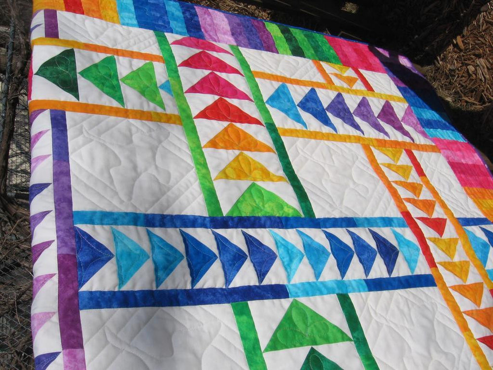 57in x 71in . This bright breezy flying geese quilt comes together surprisingly quickly. It is stunning in rainbow colours as shown here but would be equally effective in more subdued palettes.