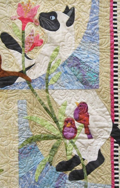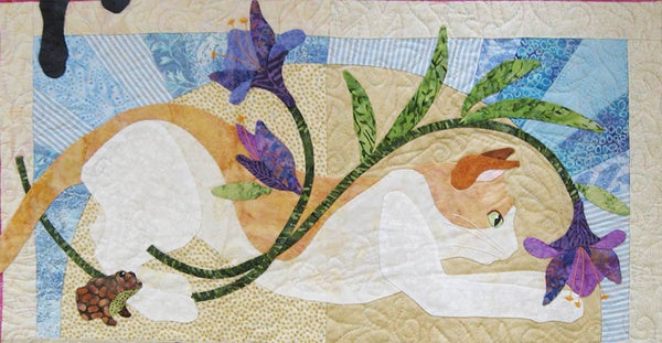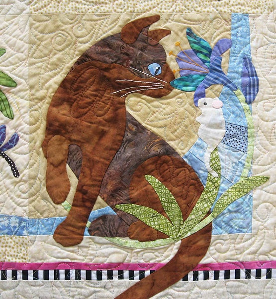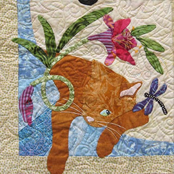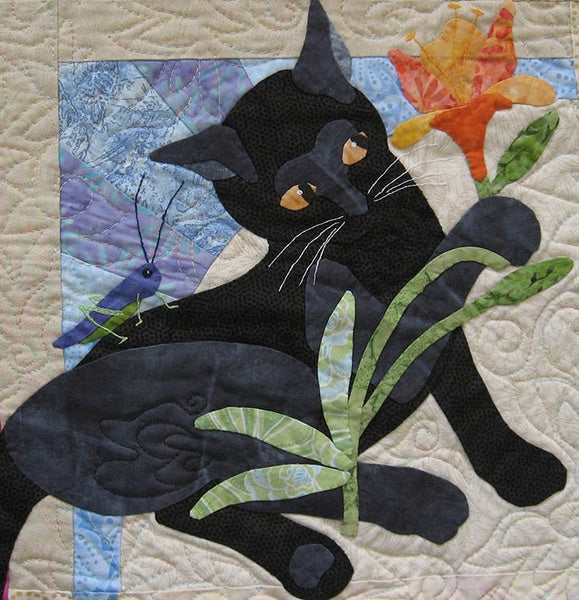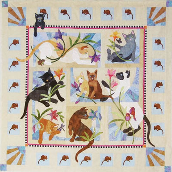 This charming cat quit project is is an eight-pattern set just loaded with personality and detail. The cats have companions from butterflies to frogs or grasshoppers and strike playful so-very-cat-like poses. The unique border features hopping mice and a little guy called “Gizmo.”