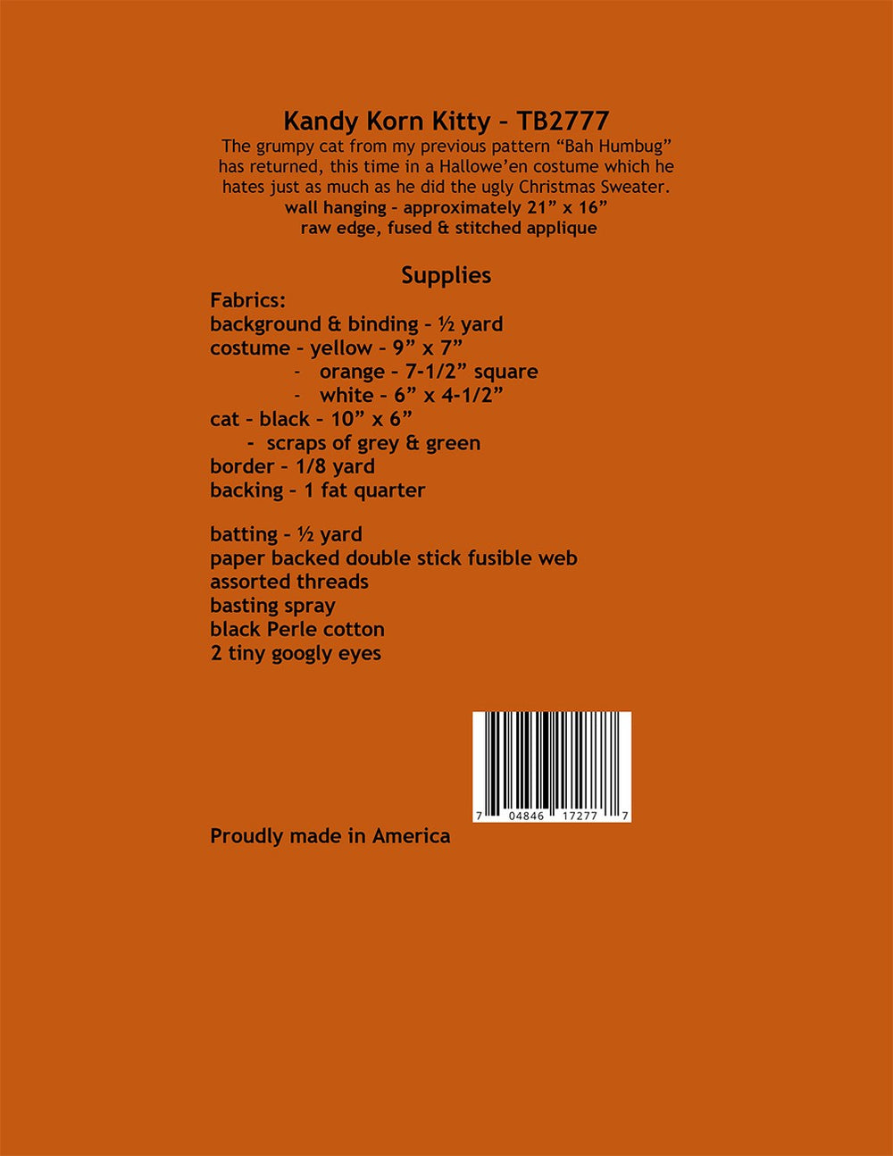 The grumpy, black cat from my previous pattern “Bah Humbug” has returned. This time he’s wearing a bright yellow, orange & white Hallowe’en costume which he hates just as much as he did the ugly Christmas sweater. From the machine stitched white web in the left corner lurks a black spider with goofy, glued on googly eyes & handstitched, Perle cotton, black legs. This is a 21in x 16in wall hanging in raw-edge, fused & machine stitched applique.