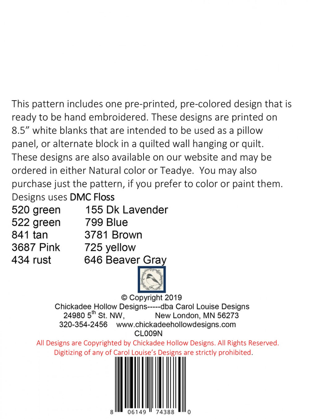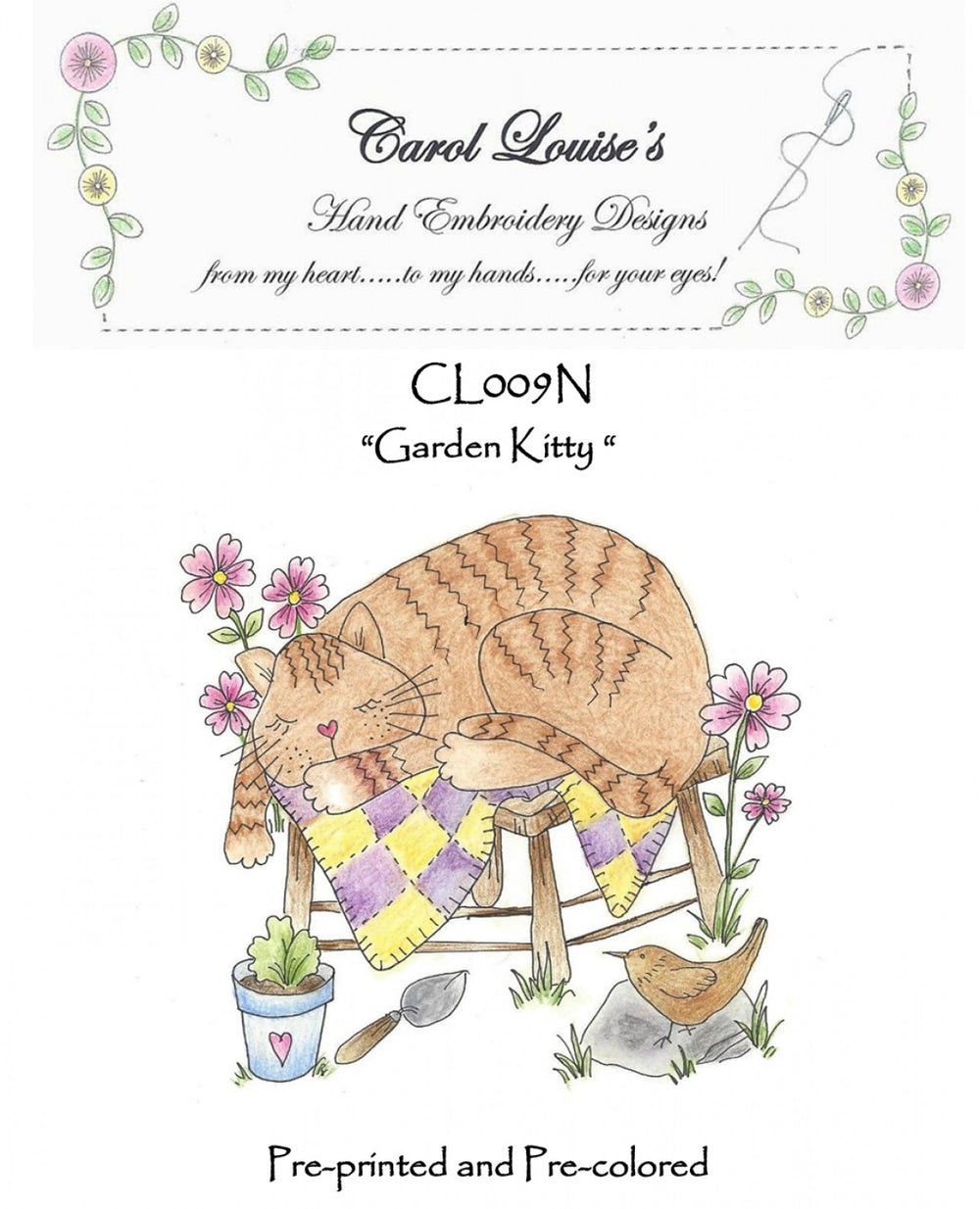 This pattern includes one pre-printed, pre-colored design that is ready to be hand embroidered.
