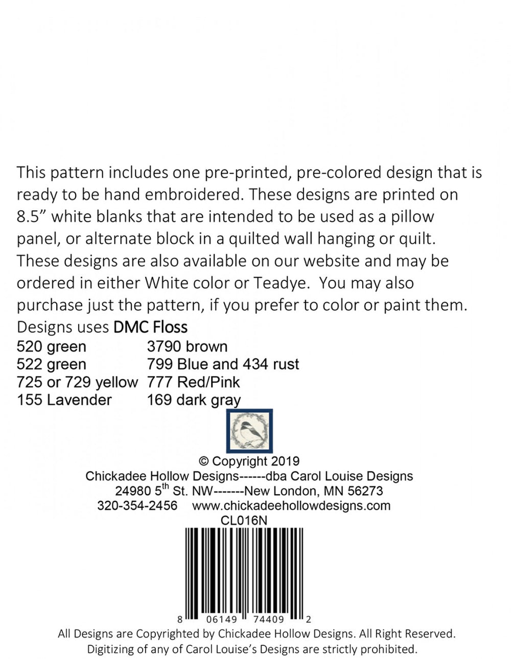 This pattern includes one pre-printed, pre-colored design that is ready to be hand embroidered. These designs are printed on 8.5” white blanks that are intended to be used as a pillow panel, or alternate block in a quilted wall hanging or quilt.