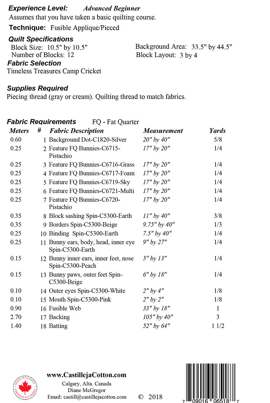 Easy to make child's quilt with an appliqued bunny. Fat quarter friendly. Fabric selection-Timeless Treasures Camp Cricket. Finished size-Crib 42in x 53in