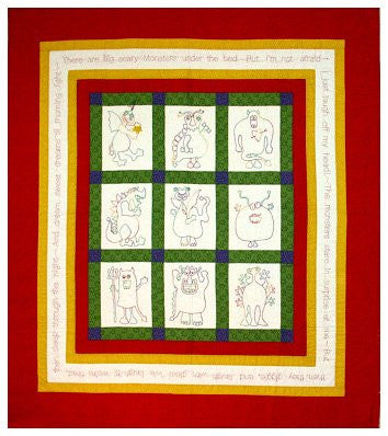 Designed by Sue Garman, this simple adaptation of her more comprehensive Monsters block-of-the-month quilt is made using multi-colored embroidery floss instead of applique. It could just as easily be made using red embroidry floss: it will still delight the youngsters in your family with its poem about giggling monsters -- which ends with everyone falling asleep and having sweet dreams through the night! The finished quilt measures 58 by 64 inches.