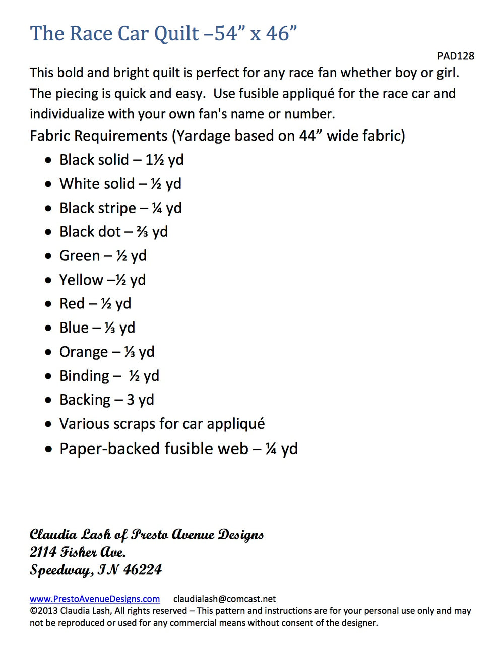 I have lived most of my life in the small town of Speedway, Indiana. Speedway is home to the Indianapolis 500 Mile Race and the Brickyard 400. Although I've only attended a few races, I enjoy all the activities which surround racing and my children are all race fans. Therefore I decided my next grandchild (boy or girl) needed a race car quilt. The quilt has a race car in the center, but feel free to individualize your quilt with a name or a phrase above the race car.
