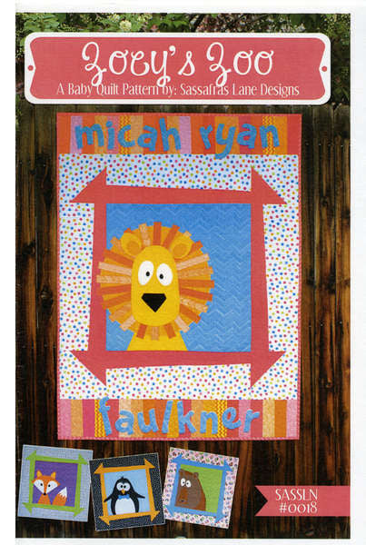 40in x 54in ¢ Zoeys Zoo is a fun and quick applique pattern you can personalize for the newest baby in your life! With 4 different animals to choose from (A lion, bear, fox and penguin) you can find the perfect match in personality.