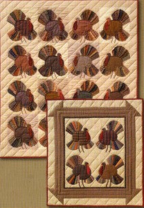 These scrappy turkeys will delight you with their fanned homespun feathers. You can stitch them using the new frayed edge applique or with traditional applique methods & both quilts have paper pieced feather units. The larger quilt, Turkey Time, measures 53.5" x 47.5" and uses six different block backgrounds.