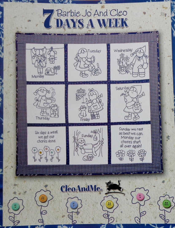 This is my 2nd book, and my most personal. I have always been fasinated by "day of the week" designs that were popular during the mid 1900's. These designs mainly depicted women, children and animals going about their daily chores. I love the idea of cute little animals washing, cleaning, dusting and making it look fun. This is my whimsical interpertation of a by gone era. A time when little girls wore aprons while imitating moms daily routine. An oh so curious kitty following her every step! 20 pages. 36" square.