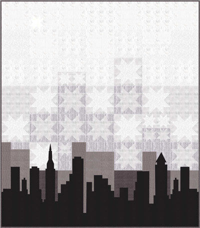 Stars blended into the night sky with the skyline applique on the bottom of the quilt. (The skyline was modeled on New York but it is not exact) The pattern features the fabric line "Compositions" by Basic Grey which is available in January 2017.
