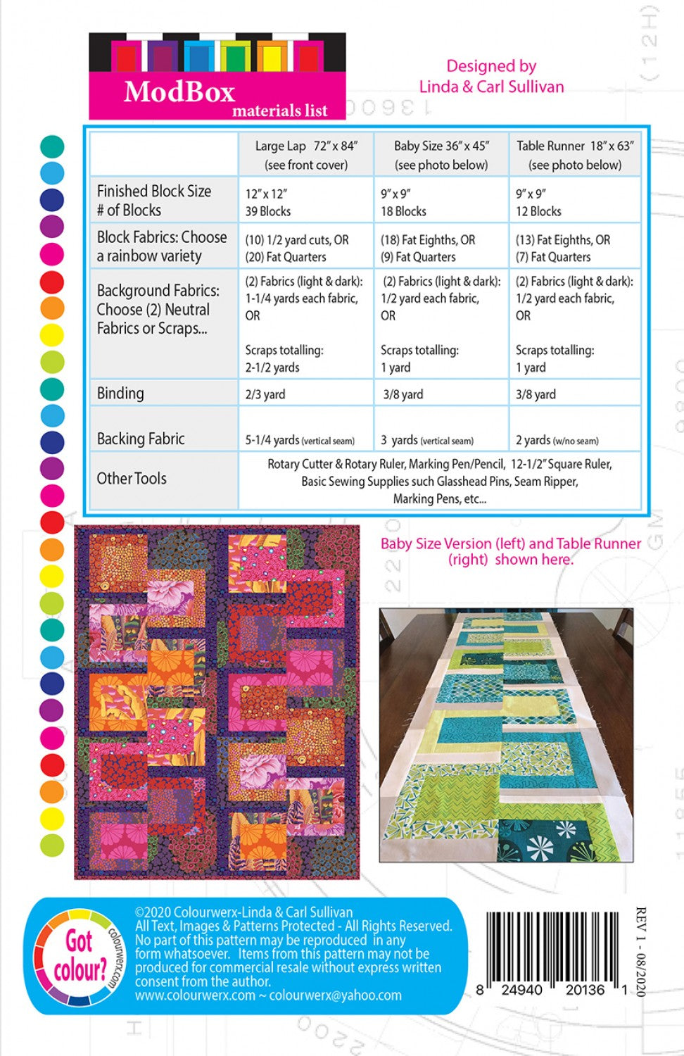 Choose 1/2 Yards or Fat Quarters. New, quick and easy ModBox pattern is so fun to piece and goes together in a snap! Looks great in solids or prints. Three sizes included - The Large Lap 72" x 84", the Baby Quilt 36" x 45", or a Table Runner 18" x 63".