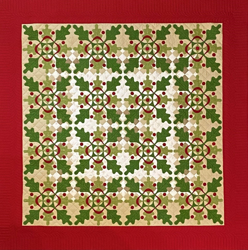 The pieced background makes it appear to glow. This is not a beginner applique project. The finished quilt measures approximately 75-inches square.
