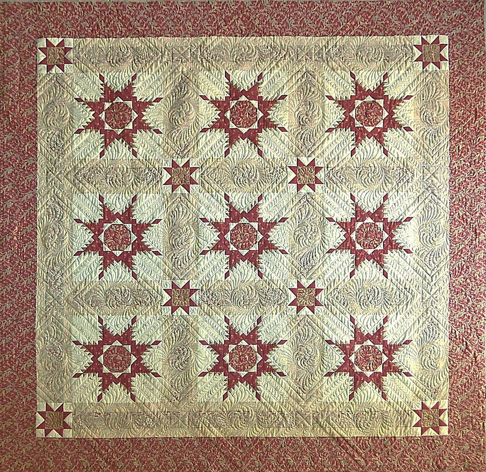 Feathered Star Heaven is a gorgeous 9-block quilt. The 74-page pattern includes thorough instructions and all of the paper foundations for both the evening star blocks and the feathered star blocks. The finished quilt measures 81 by 81 inches.