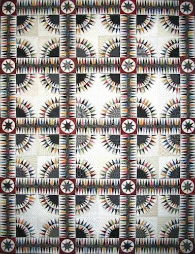 Sue Garmans classic New York Beauty quilt comes in two sizes: 50 by 50 inches or 72 by 94 inches. Complex and intricate, the pattern simplifies making the quilt through the use of paper foundations. Quiltmakers must make copies of the foundation papers before sewing can begin.