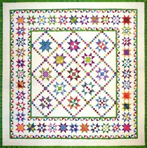 Complete Pattern SetDesigned as a 12-month block-of-the-month quilt, this pattern is filled with stars, stars, and more stars! The pattern includes paper foundations for all of the half-square triangles in the stars and borders. There are thirteen 8-inch star blocks set among Irish chain blocks - and more stars in the outer border. The instructions are very thorough and contain plenty of visual images of the blocks and how to make them. The finished quilt measures 84 inches by 84 inches.