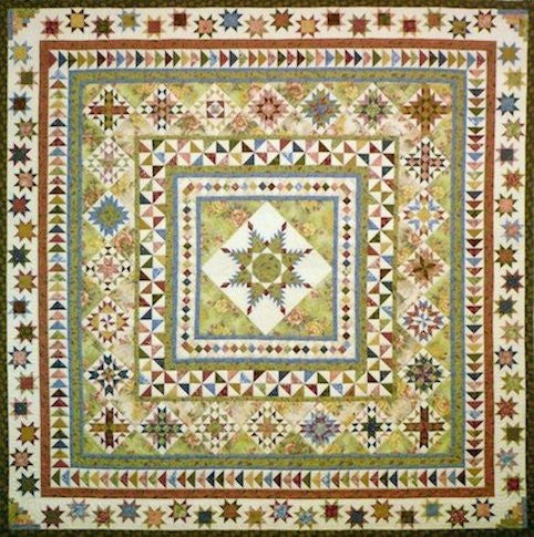 Stars for a New Day starts with a feathered star block set on point and adds a multitude of borders. This is a very popular block-of-the-month; the pattern instructions are very detailed and offer lots of options for simplifying steps. The finished quilt measures 85 inches square.