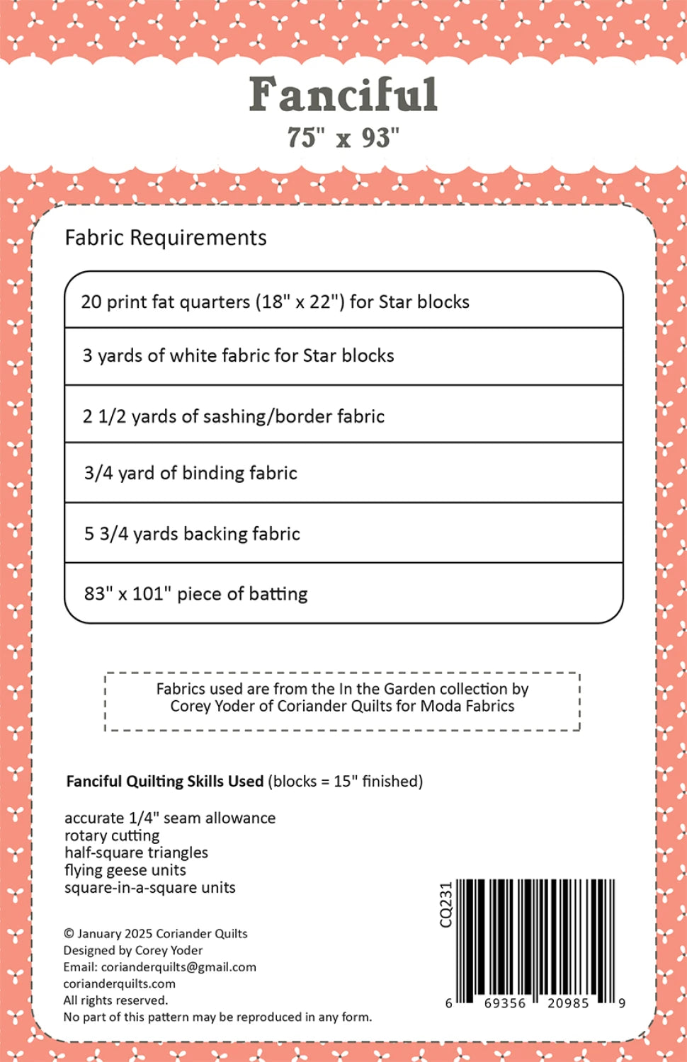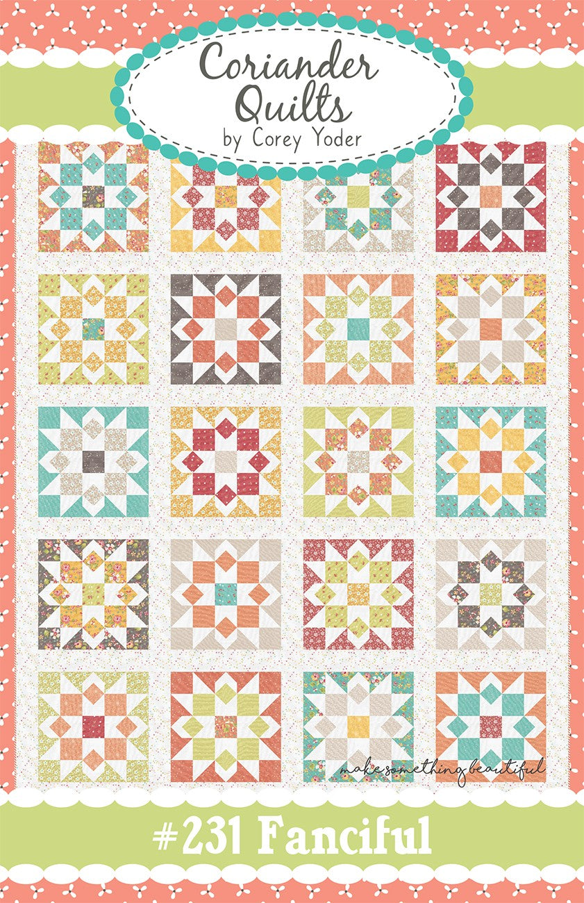 The Fanciful Quilt pattern designed by Corey Yoder of Coriander quilts is a full color booklet type pattern with detailed illustrations and instructions.
